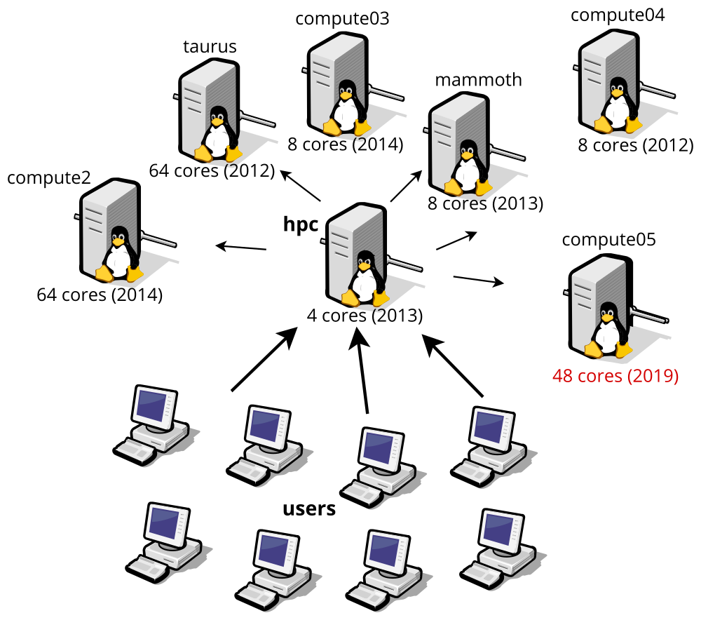 The cluster is arranged in a master/slave configuration; users log into HPC (the master) and use it as a “jumping off point” to the rest of the cluster. Here's a diagram of the topology. For each server, we mention the number of CPUs and the year it was commissioned: